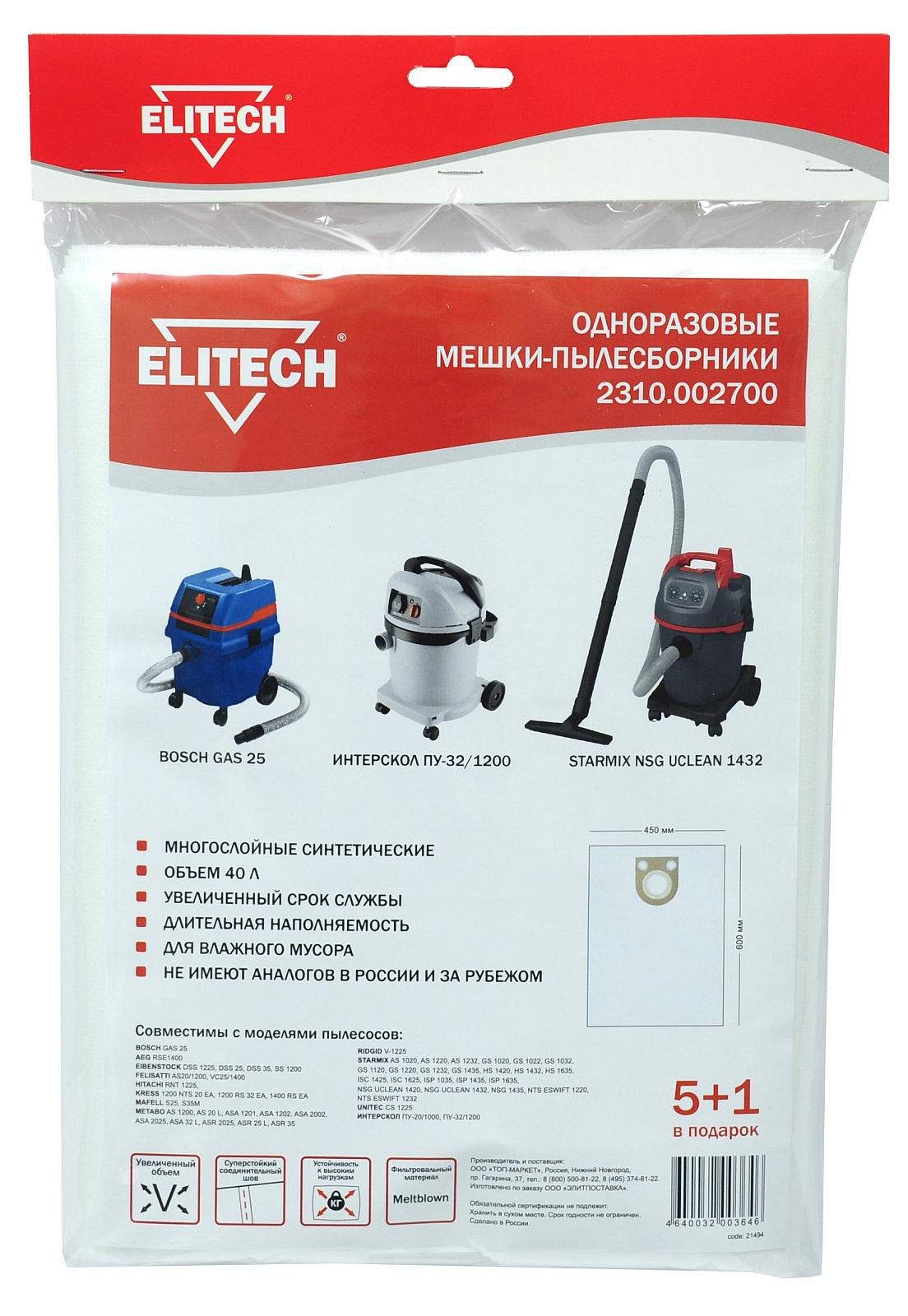 Одноразовые синтетические многослойные мешки-пылесборники 5+1 шт. для пылесосов BOSCH GAZ 25