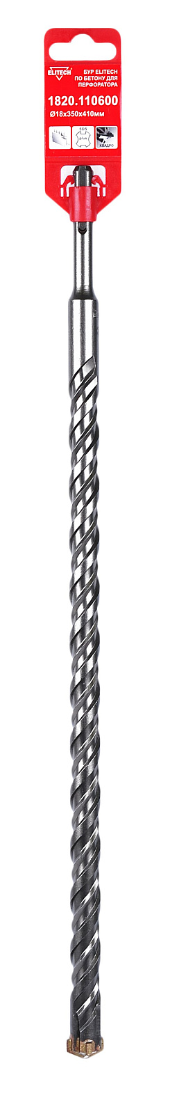 Квадробур по бетону диаметром 18 мм и длиной 410 мм с четырьмя твердосплавными режущими кромками и двойной спиралью для перфораторов с патроном SDS-plus, представляет собой инструментальную оснастку, с помощью которой можно сверлить отверстия в конструкциях, изготовленных также из кирпича, натурального и искусственного камня.
