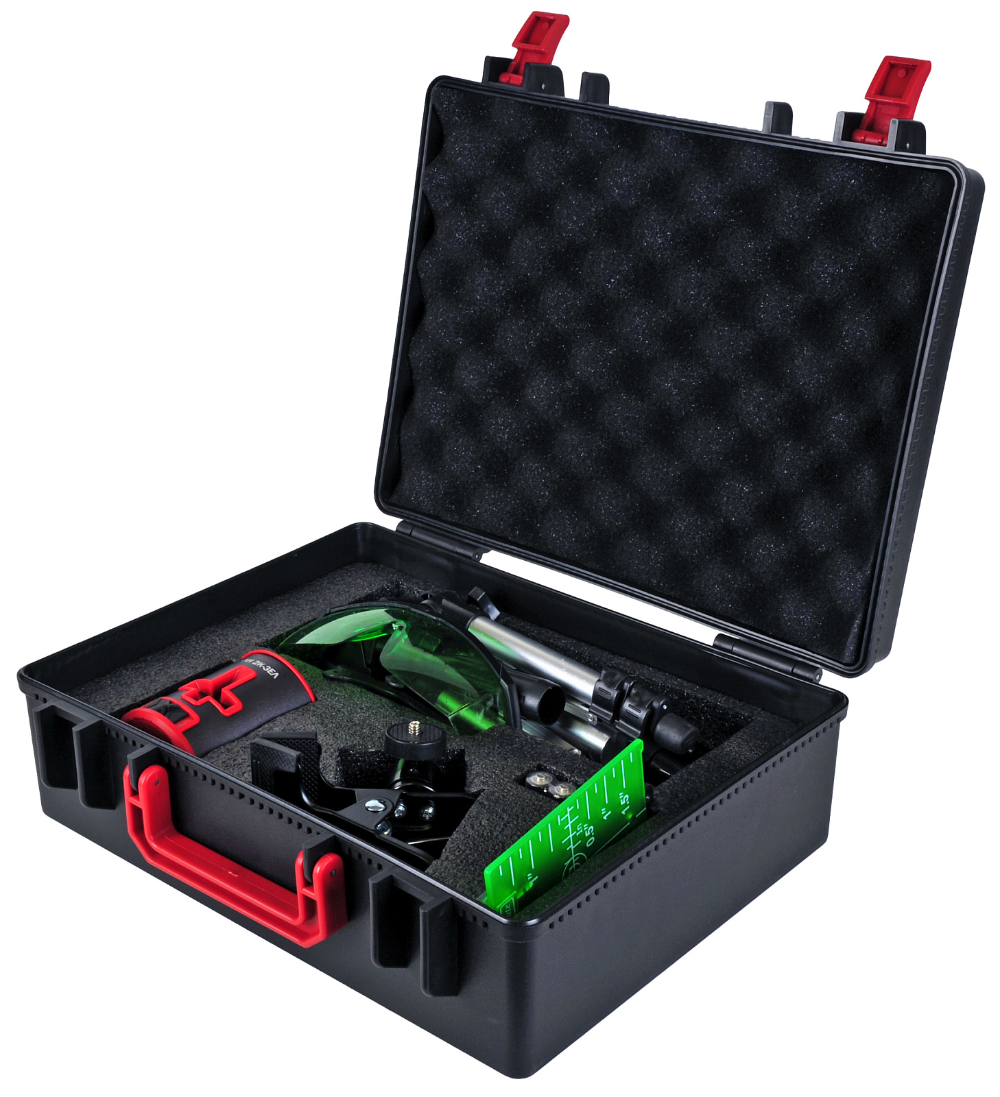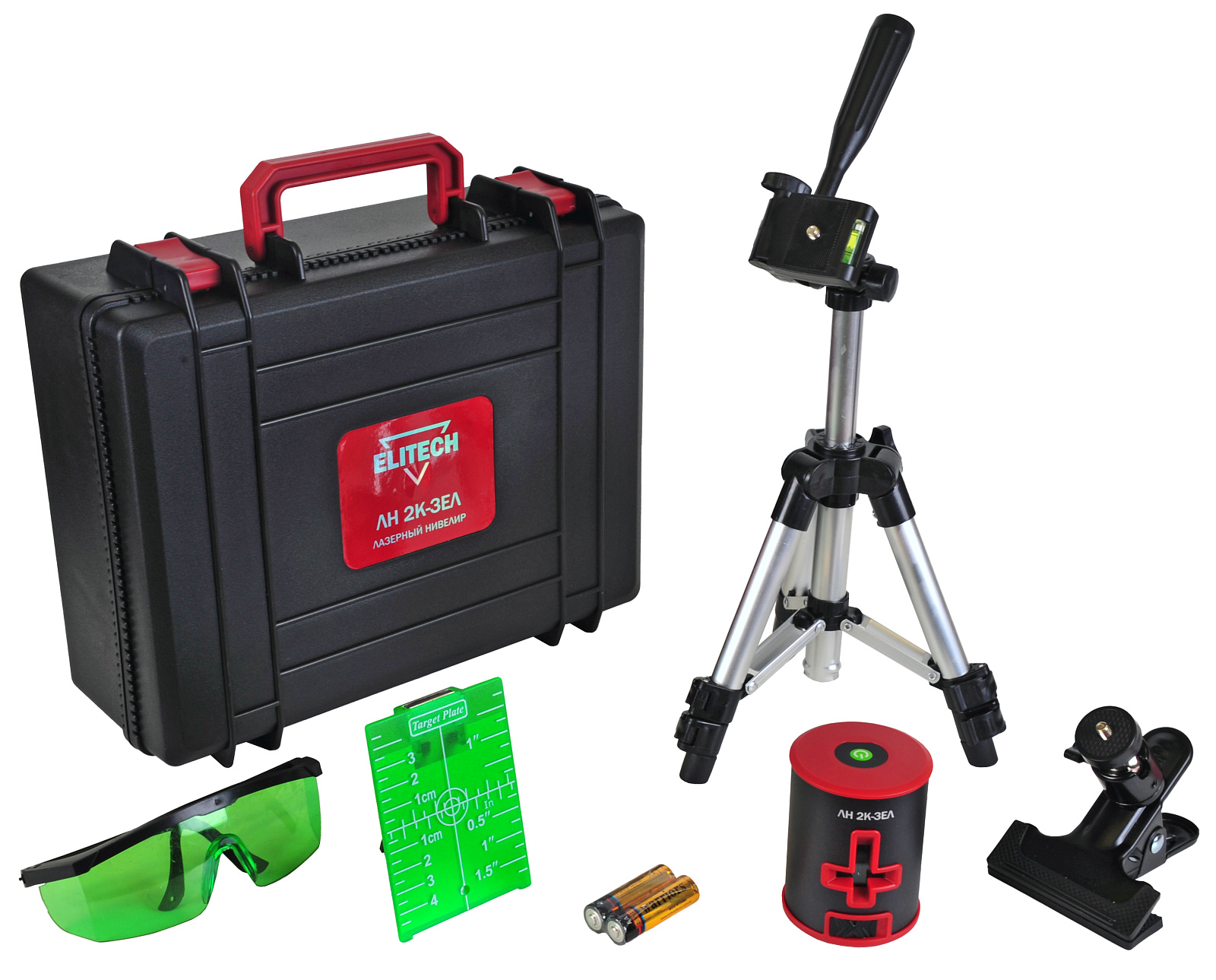 Нивелир поставляется в пластиковом кейсе с расширенной комплектацией: очки, штатив, мишень, зажим-прищепка.