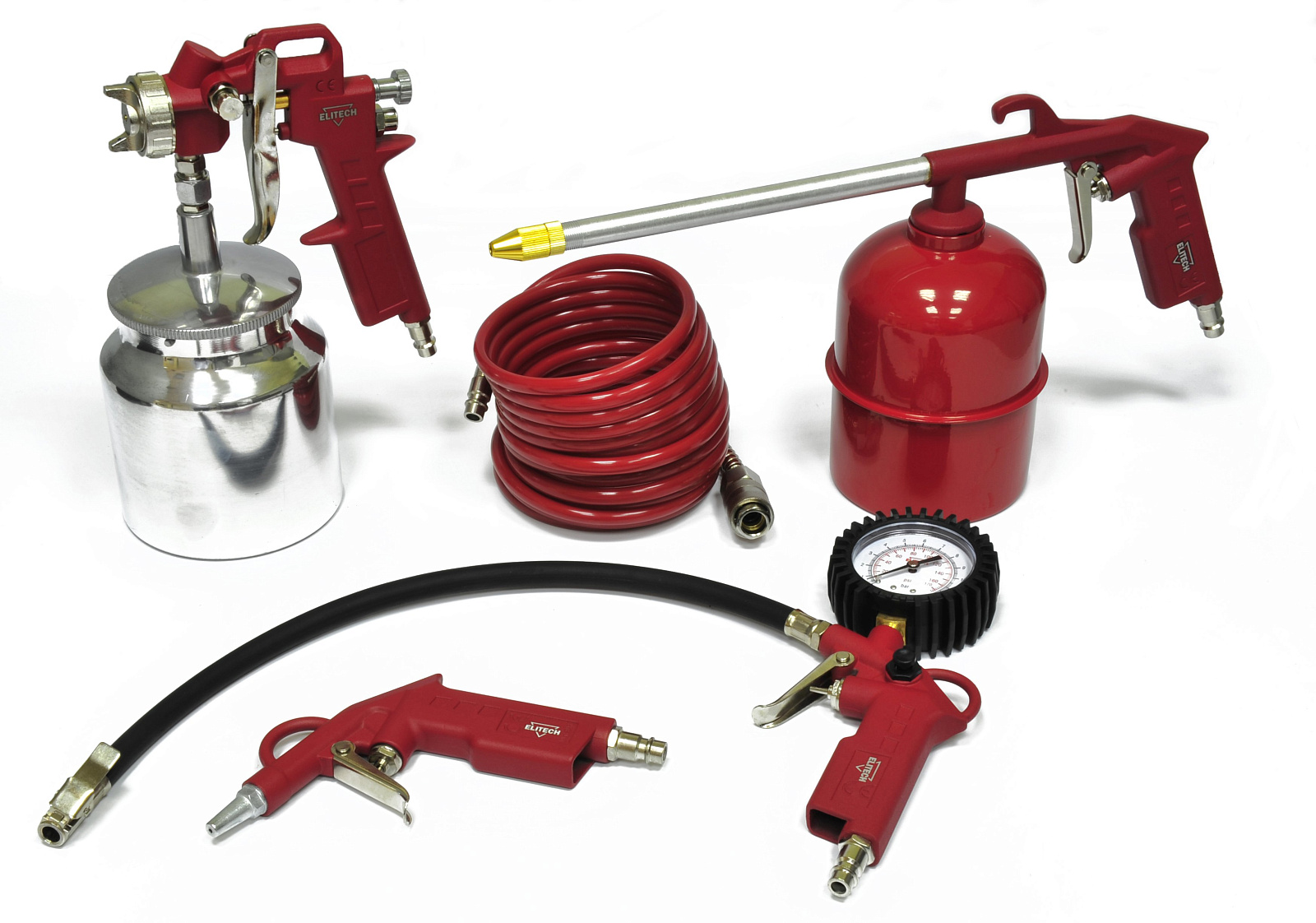 Набор пневмоинструмента ELITECH представляет собой универсальное решение для выполнения покрасочных, очистительных и сервисных работ. Данный комплект предназначен для нанесения лакокрасочных и антикоррозийных покрытий, продувки поверхностей сжатым воздухом и подкачки шин в условиях мастерской или гаража.