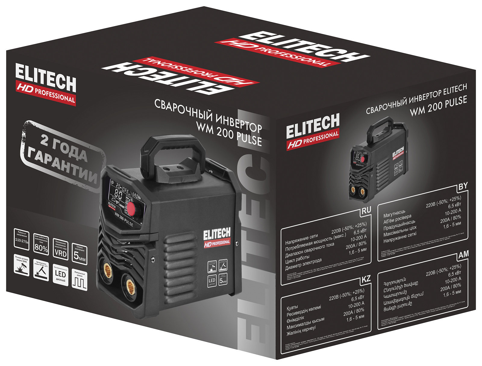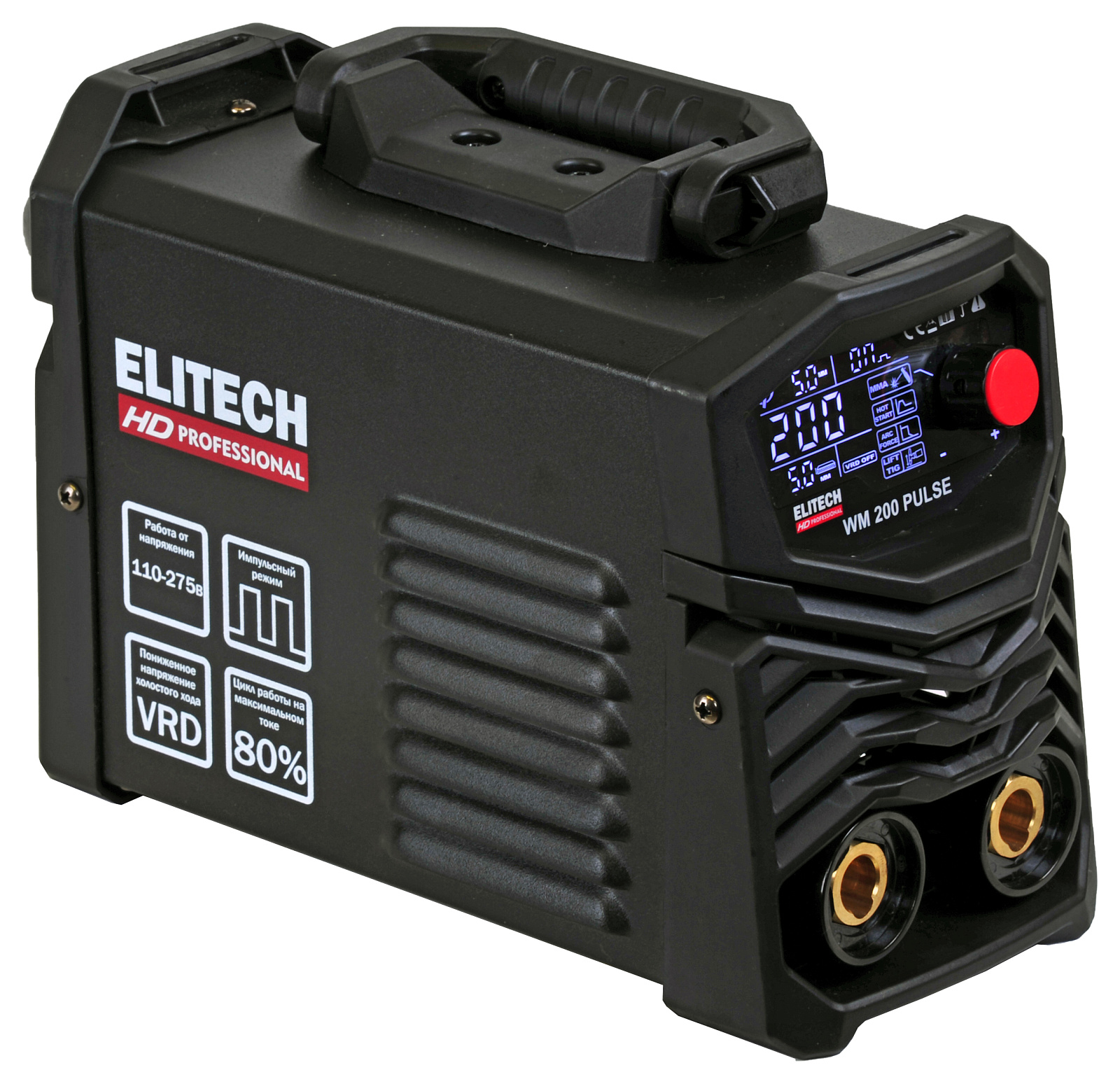 Сварочный инвертор ELITECH HD WM 200 PULSE осуществляет ручную дуговую сварку штучными плавящимися электродами (MMA), а также имеет возможность аргонодуговой сварки (TIG) на постоянном токе неплавящимся вольфрамовым электродом в среде защитного инертного газа – аргона (сварка только углеродистых и нержавеющих сталей).