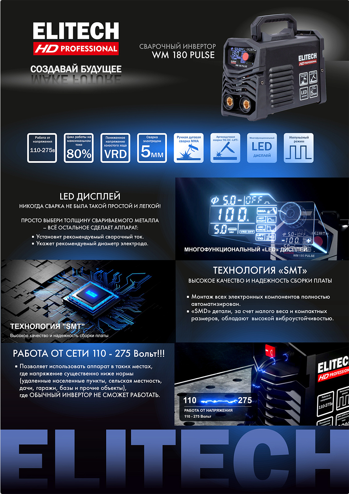 Сварочный инвертор ELITECH HD WM 180 PULSE осуществляет ручную дуговую сварку штучными плавящимися электродами (MMA), а также имеет возможность аргонодуговой сварки (TIG) на постоянном токе неплавящимся вольфрамовым электродом в среде защитного инертного газа – аргона (сварка только углеродистых и нержавеющих сталей).